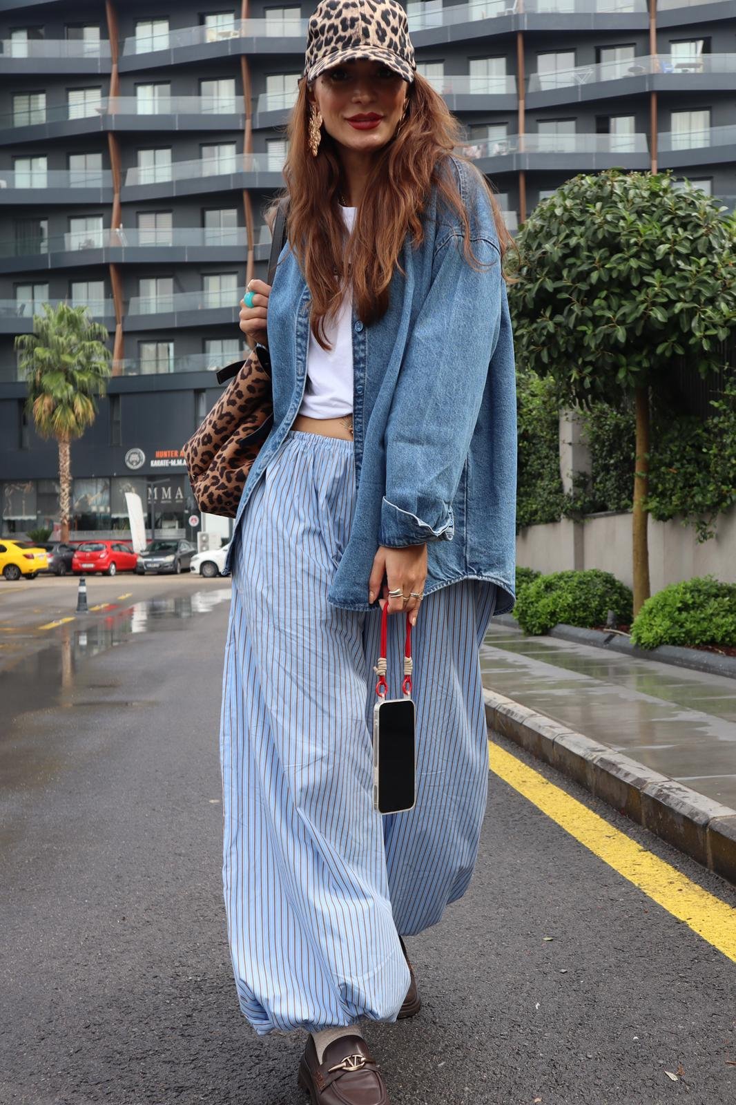 Mavi çizgili şalvar, günlük kullanım, ev oturması ya da arkadaş toplantılarında tercih edebileceğiniz çok yönlü bir üründür. Salaş ve modern görünümü sayesinde farklı kombinlerle kolayca uyum sağlar. Spor ayakkabılar ve sade bir tişört ile rahat bir stil yaratabilir; şık aksesuarlarla kombinleyerek zarif bir görünüm elde edebilirsiniz. Moda ve işlevselliği bir arada sunan bu tasarım, her gardıropta mutlaka bulunması gereken bir parçadır.