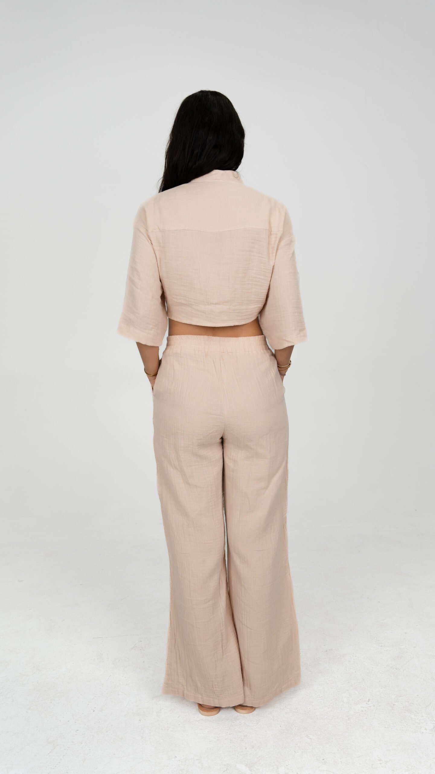 Müslin kumaş, beli lastikli ince dokulu terletmeyen pantolon ve göğüs altından bağlamalı müslin gömlek. Hem şık hem rahat kurtarıcı bir takım. Ürüne ait parçalar pantolon ve gömlek kategorilerinde ayrı ayrı da satılmaktadır.